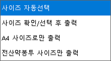 선택된 옵션에서의 기준에 의해 출력사이즈를 자동으로 선택합니다. - 사이즈 확인/선택 후 출력 : 출력시 아래와 같은 팝업이 나오고, 팝업창에서 사이즈를 선택할 수 있습니다.